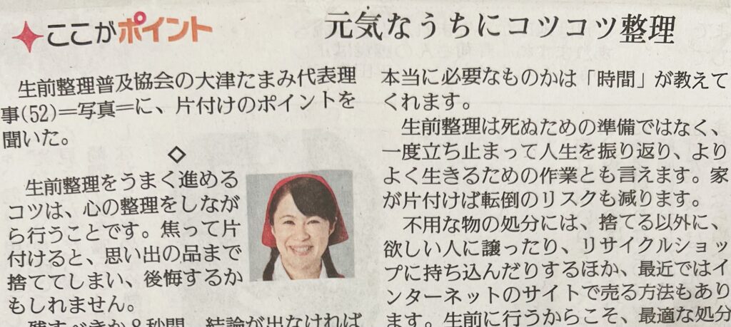 本日の讀賣新聞に中川智子指導員登場!生前整理実践ジャーで、昨年受講生数ナンバーワンを取得した中川智子指導員の記事が、本日の讀賣新聞にどかーんと掲載されていますよ^ ^
