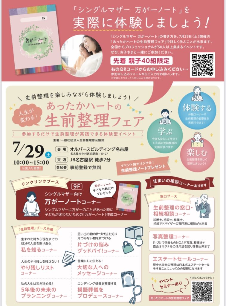 7月29日あったかハートの生前整理フェアで行われるシングルマザー万が一ノート体験会。お母さんがノートを書いている間、大学生のお兄ちゃんお姉ちゃんが勉強を見てくれるよ。